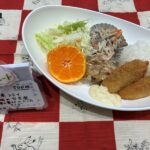 日替わりお楽しみランチ白身魚フライ豚肉の甘辛煮15種の素材の入ったサラダご飯みかん